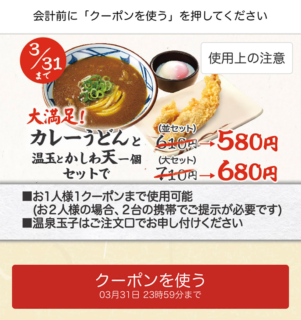 毎月1日は釜揚げうどんが半額です。正確には10円未満が切り捨てになっているので半額以上値引きになります。この日はもともとお得なので、アプリ限定クーポンよりも釜揚げうどんを食べる方がお得です。