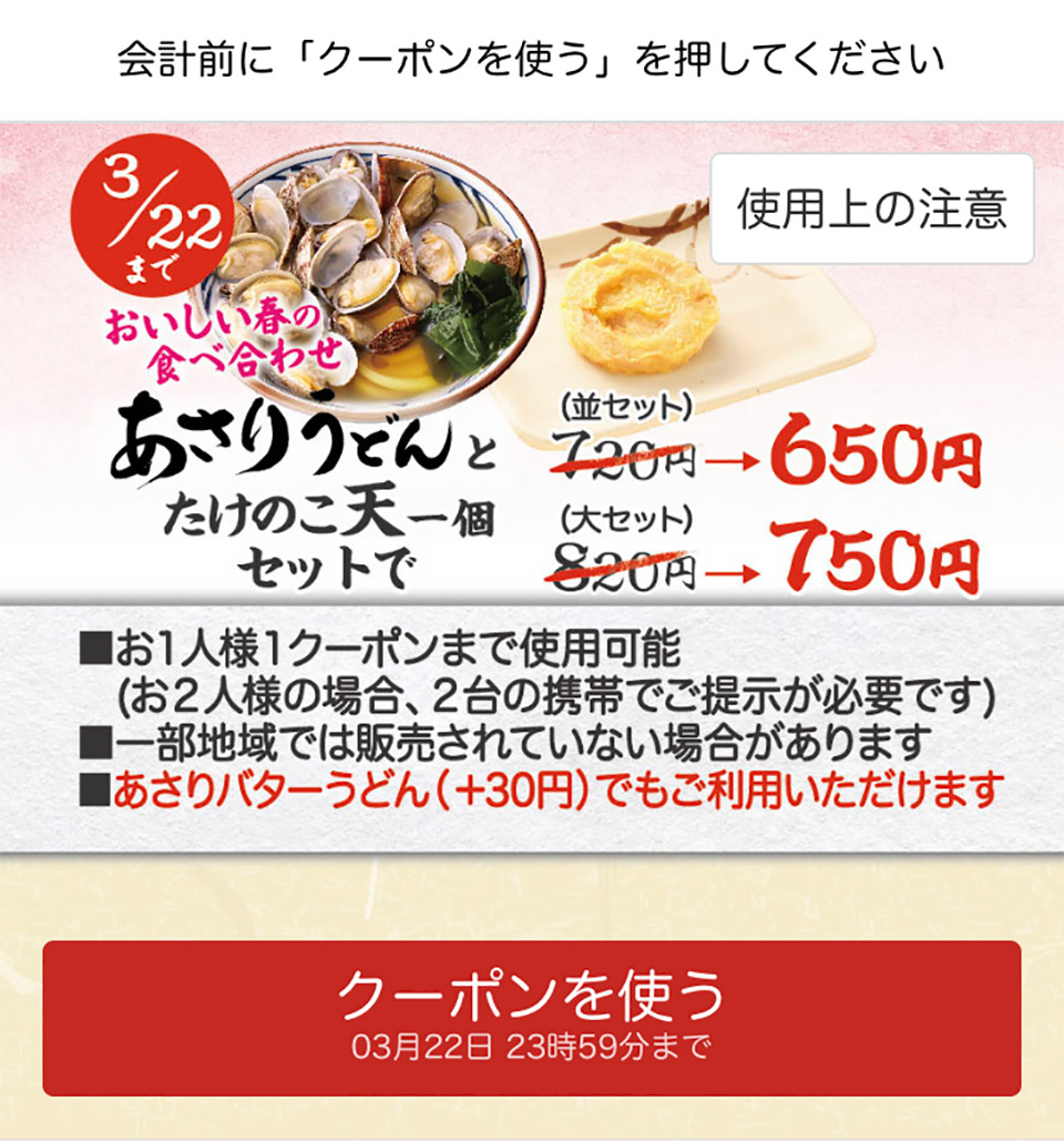 「あさりうどんとたけのこ天1個セット」で70円引き