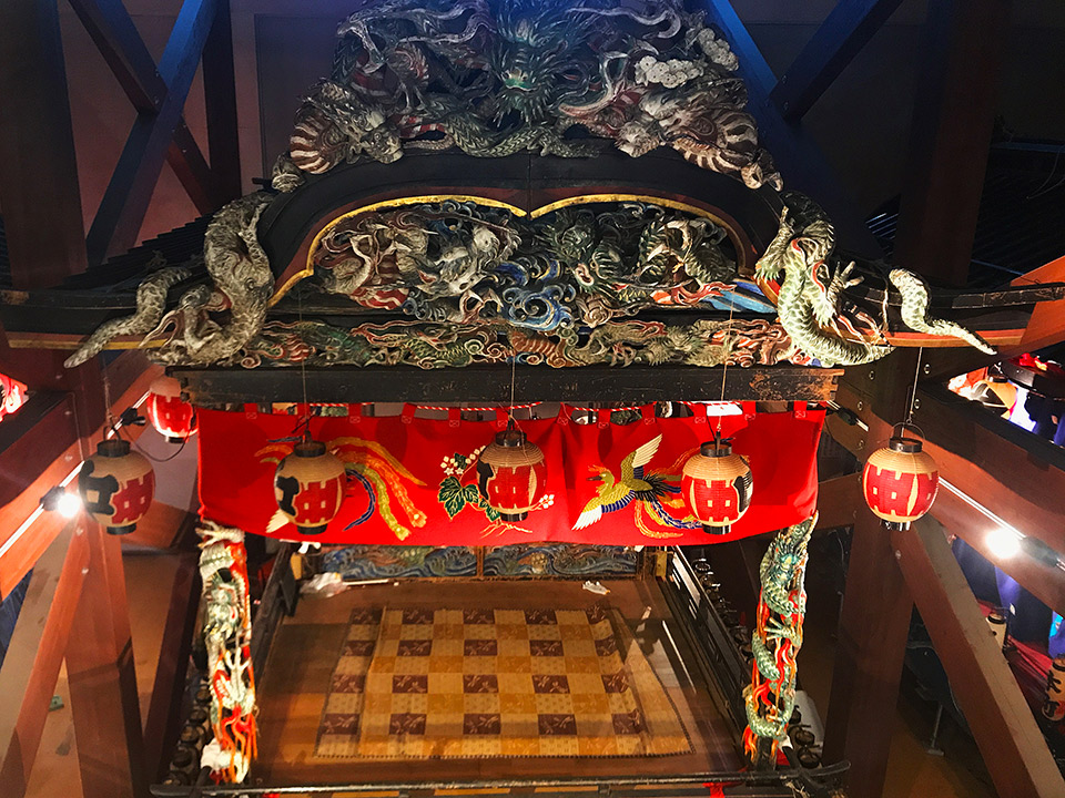 屋台と言っても、食べ物の屋台とかではなく、お祭りの山車(だし)の展示スペースです。明治初期に作られた有形民俗文化財、小前田(おまえだ)の山車が上町、中町、本町と3台展示されています。倉庫兼ギャラリーというところでしょう。龍の彫り物が迫力があります。