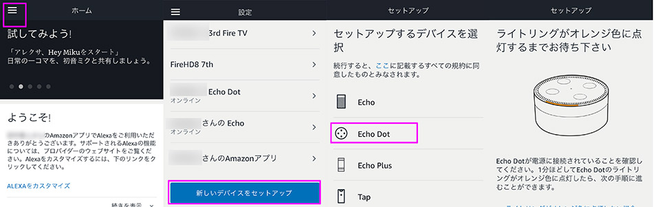 左上の「三」のマークのハンバーガーメニューを押して「設定」→「新しいデバイスをセットアップ」でセットアップするデバイスを選びましょう。