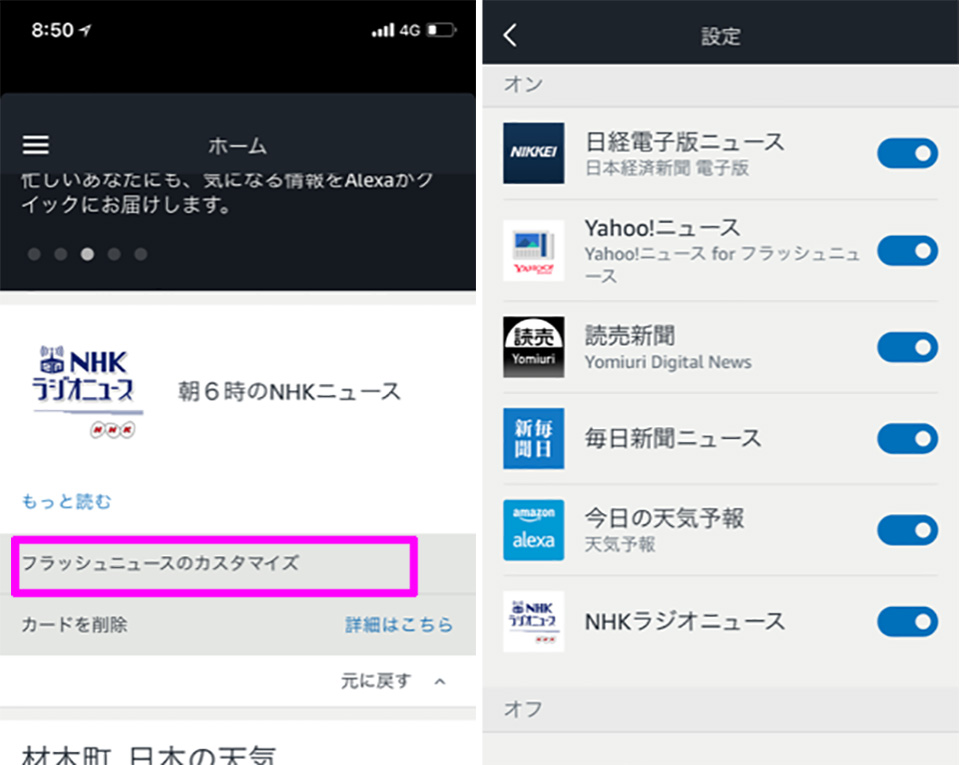 こちらの記事に書いていますが、初期のニュース設定には注意が必要だと思います。最初のニューススキルの設定が、NHKラジオニュースのスキルになっているため、NHKラジオの音声読み上げではなく番組がそのままはじまります。これをそのまま聴いているととんでもなく時間がかかるので、設定から「ヤフーニュース」などダイジェストとしてまとまっているものを選んだほうがいいでしょう。