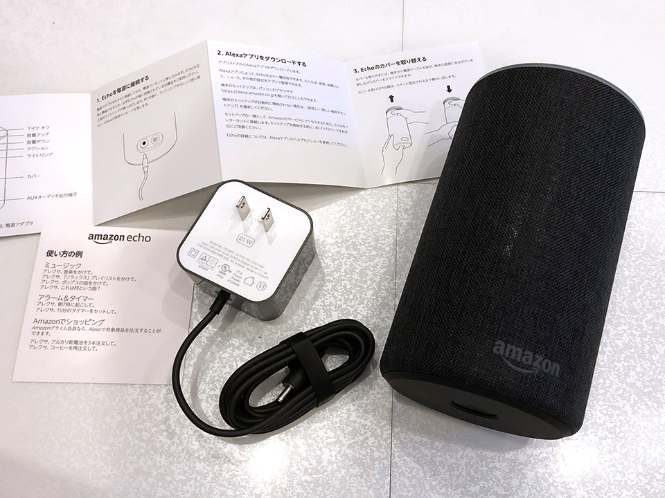 開封していきますが、Amazon Echo本体、アダプター(21W)、説明書、使い方例シート(話しかけ方が書いてあるカード)が入っています。それだけです。