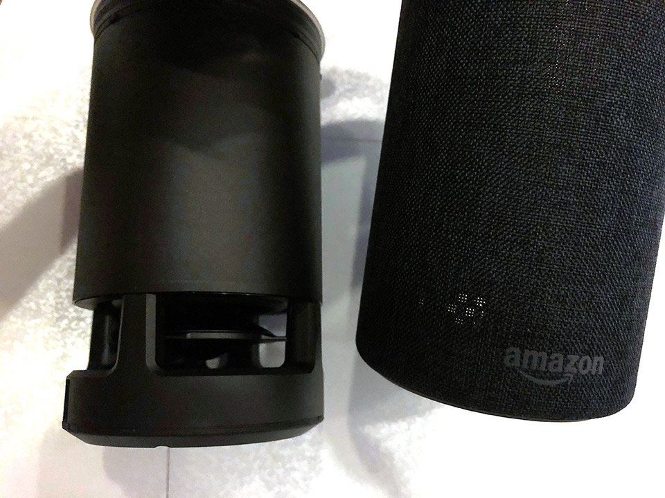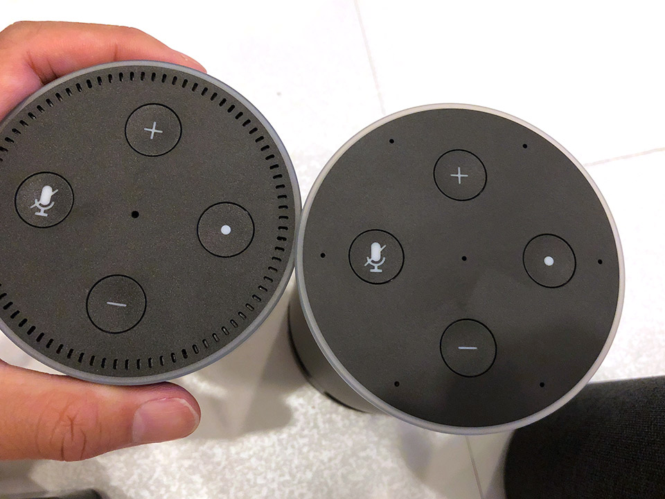 ぱっとみ、Amazon Echoにはマイクがの穴が7つないので、対応していなかと思ったのですが、Echoシリーズすべてが7つのマイクを搭載しているようです。それぞれのマイクの信号を合成、ノイズや反響音、音声指示以外の音楽や話し声さえも抑制することで、さわがしい環境でもAlexaが音声入力をはっきり聞き取ってくれるもので、他のAIスピーカーに比べ聞き取り間違いが少ないです。