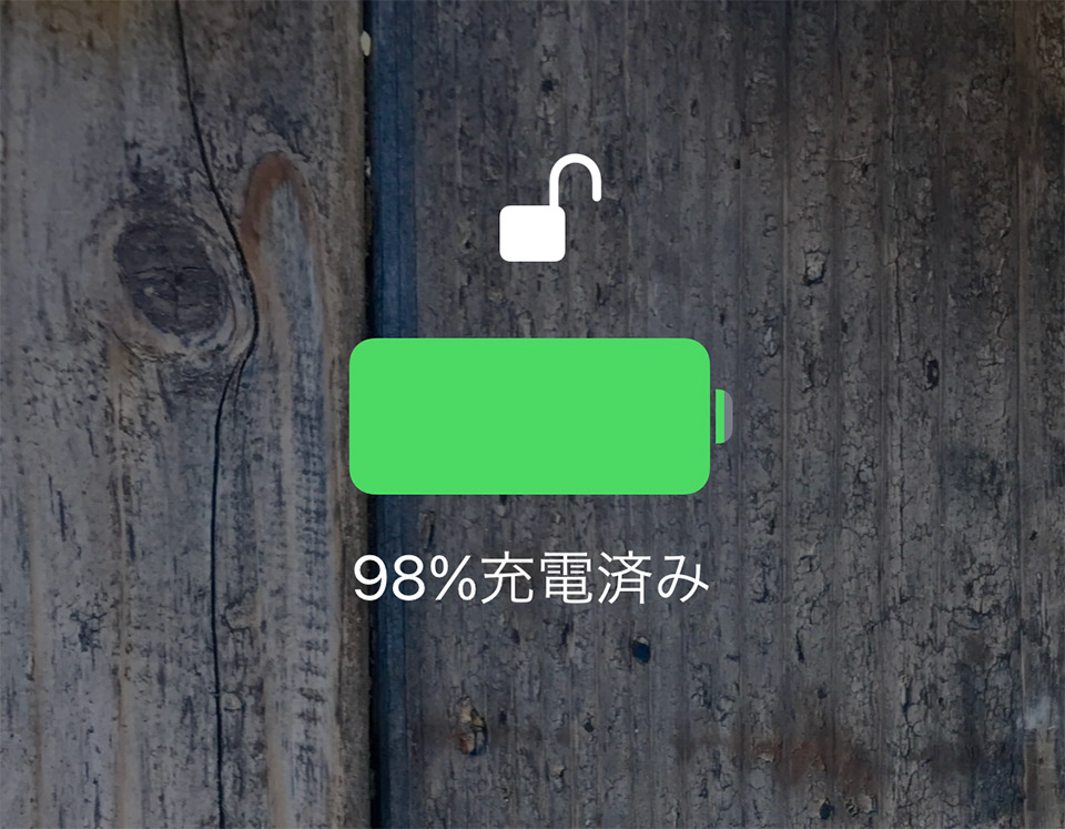 Lightning充電ケーブルにつないだ瞬間、ワイヤレス充電器に置いた瞬間、充電済みの容量が表示されますよ。ほんの一瞬出るので、あまり実用的ではないですね。ケーブルを挿したり、ワイヤレス充電器に置くのを繰り返すくらいならば、最初にお知らせした「コントロールセンターを呼び出す」のが一番簡単です。