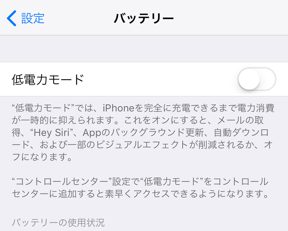通常のiOS、iPhoneデバイスでは「設定」の「バッテリー」に電池容量を%表示させる機能がありましたが、iPhone Xでは表示設定自体がなくなっています。「バッテリー」項目を見ても「省電力モード」と「バッテリーの使用状況」のみの設定となっています。