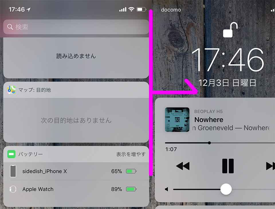 上からコントロールセンターを呼び出すのか、左からウィジェットを呼び出すのか、この2つの方法が便利です。バッテリーウィジェットをウィジェットの上方に設置すれば、左からスライドを少しするとバッテリーマークが見え、さっと確認するのに適しています。上まで指を持っていくと大変なので左からスワイプは結構便利なのです。ぜひ左から引き出す方法をお試しください。