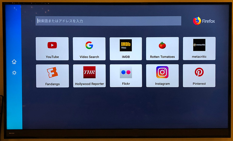 Firefoxだと完全にテレビ用のUI/ユーザーインターフェースになっており、YouTube、Instagram、ピンタレストなどがテレビで見る前提になっていますね。特にYouTubeはきれいに整っています。