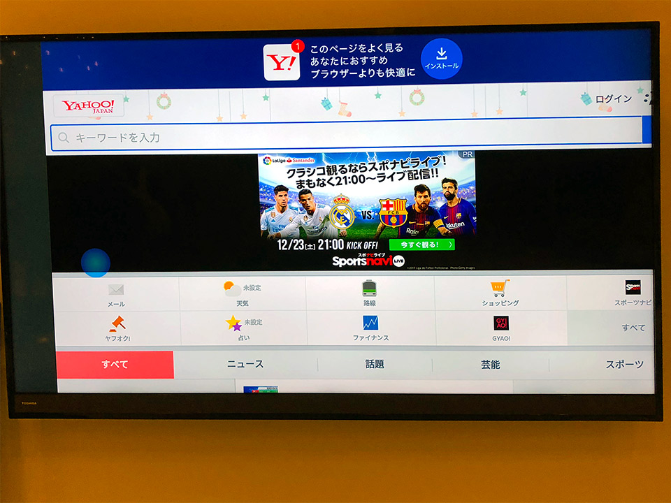 ちなみにブラウザはモバイルデバイスもしくはタブレットと認識されるようです。レスポンシブデザインのサイトではモニター解像度が1920あってもサイドバー(右カラム)が落ちてしまいますし、ヤフーではスマホサイトがテレビの幅一杯に表示されてしまい、あまり実用的ではありません。