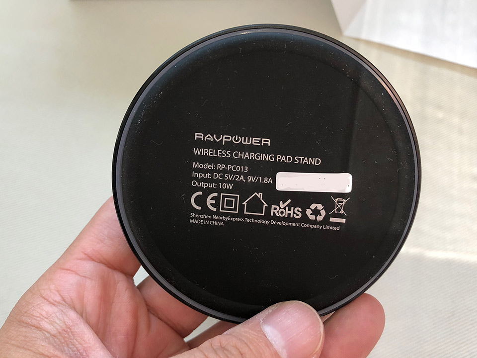 全体にラバーコーティングが施されており、安っぽい印象はなくむしろマットで気持ちがいいです。裏面の表示を見るとアウトプットは10Wまで行けるようです。今後ワイヤレスの急速順電対応端末が増えることにも対応でいますね。