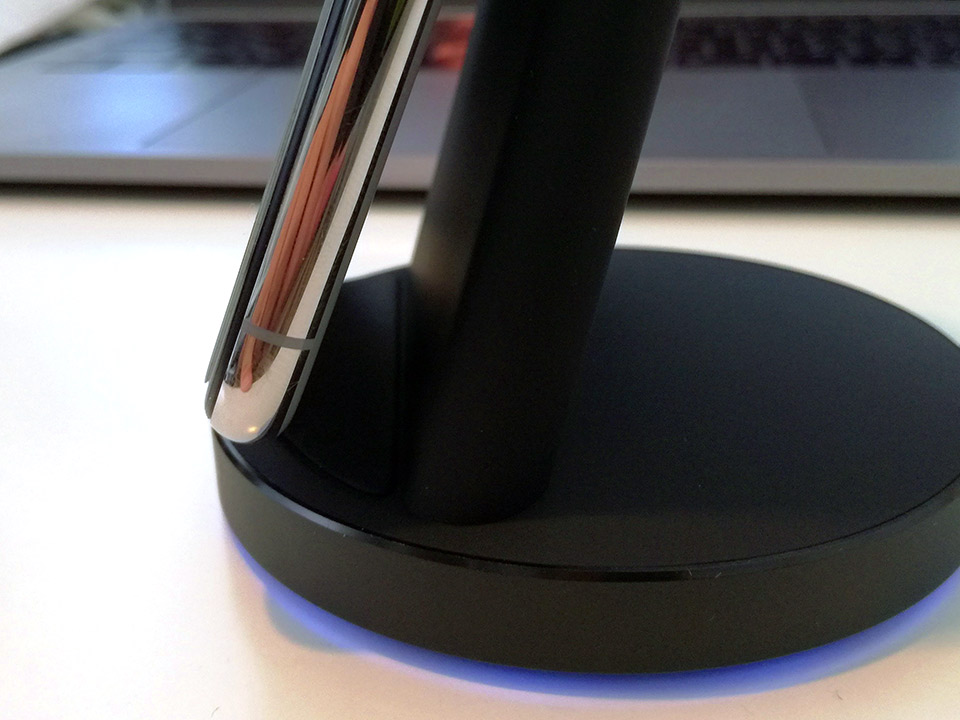 充電が始まると本体下のLEDリング/フットライト?部分がぼんやり青く光ってカッコイイー。(iPhoneは当初最初だけ光るということだったんですが、iOS11.2からか、すっごくぼんやりと薄暗く光が何回か光るようになりました。結構暗いです。)