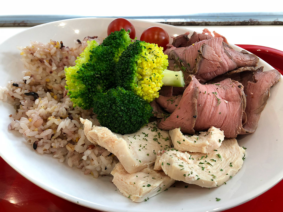 今回のパワープレートはチキンブレスト+ローストビーフです。チキンブレストってなに?と思っていたんですが単に鶏の胸肉です。ブロッコリーとミニトマトは勝手についていました。