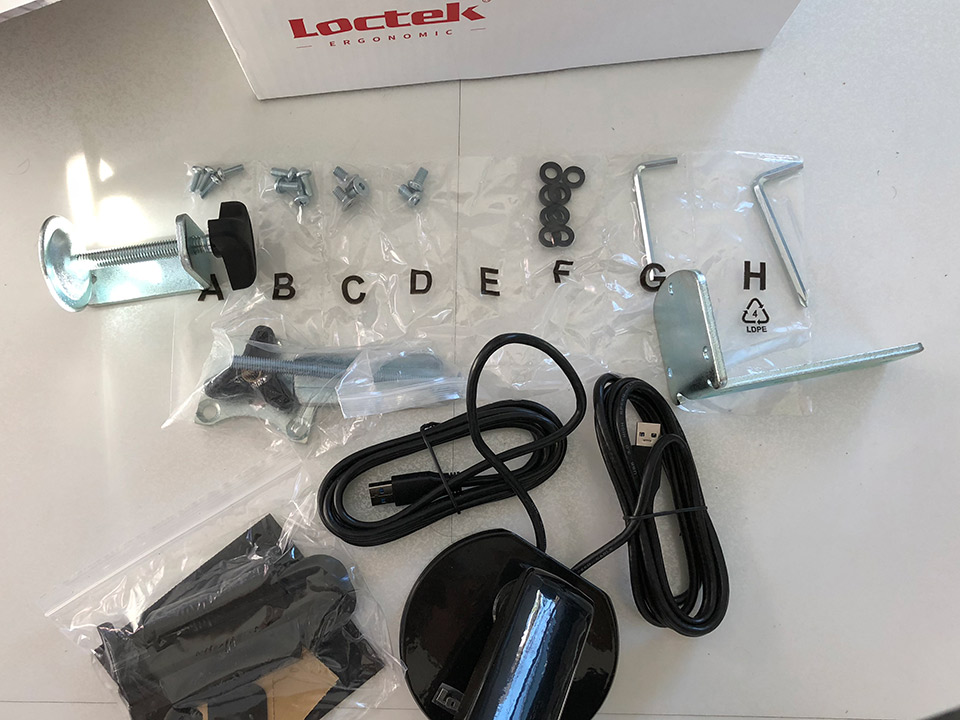 本体のほか付属品はテーブル天板への固定用の器具がふたつ付いてきます。クランプ式とグロメット式。好みの方法が選べるのはいいですね。