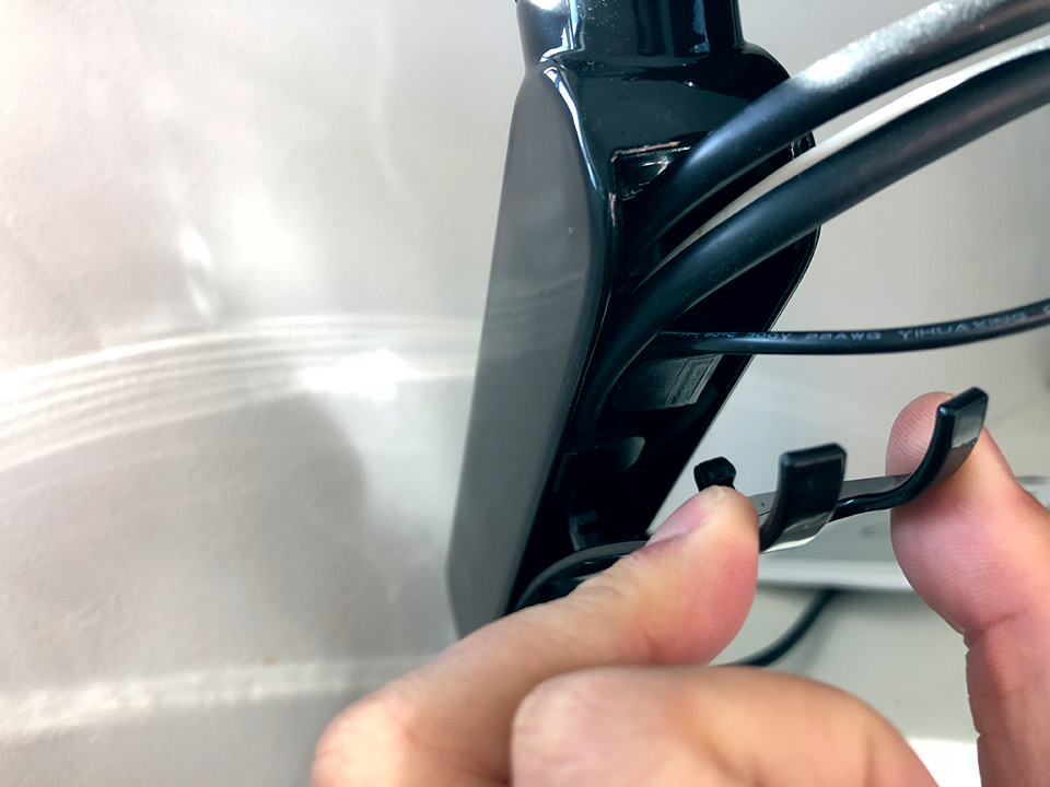 ケーブルはアーム内のポケットとアーム下のケーブルホルダーに挟むことで、びろーんとケーブルがブラブラしたりすることはなく、すっきりスマートにしまっておけます。