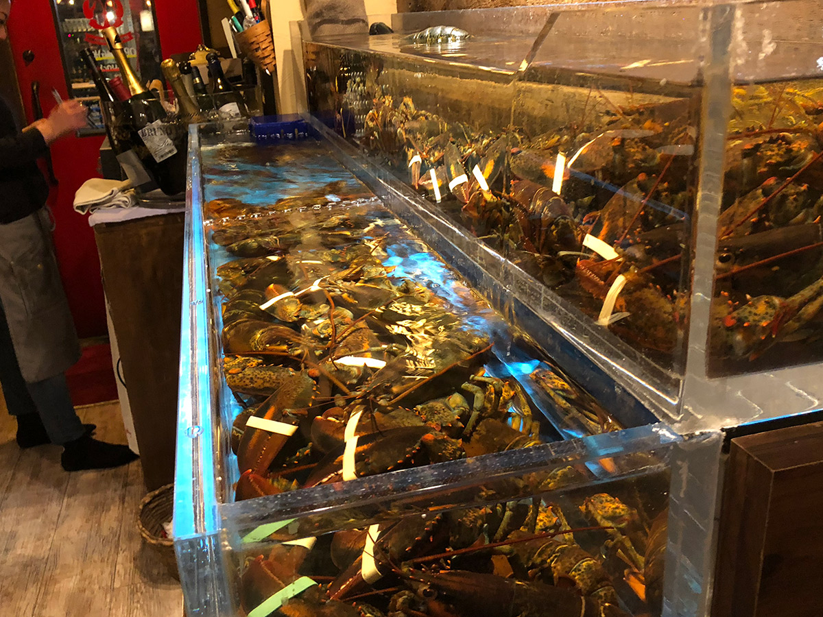 生簀に大量に待機しているロブスターさんたち。この規模のお店でこれだけの在庫を持っているのはかなり珍しいのではないでしょうか。