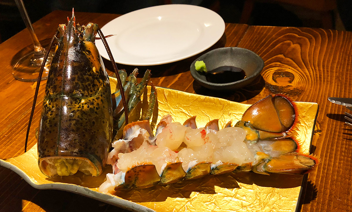 まずは、ロブスターの活け造りにしたものごやってきます。すでにボイル用にハサミは取り除かれていますね。わさび醤油をつけていただく刺身風スタイルです。