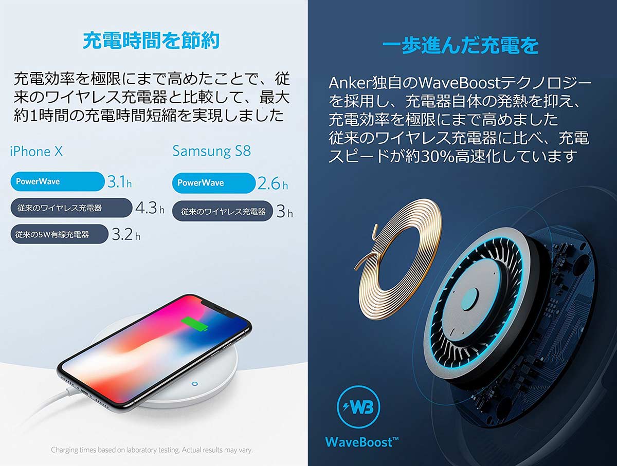 従来のワイヤレス充電器に比べ、約25%充電スピードが速くなり、充電時間を短縮。4.3時間充電が3.1時間になっています。また、5mm厚のケースもつけたまま充電が可能です。※ただし、約5mm以上の厚みがあるケースや金属製ケースや磁気を帯びたケースおよびクレジットカードは、充電前にはずす必要があります。