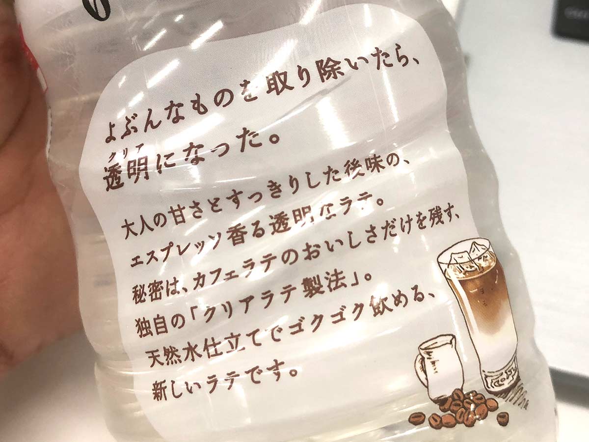 コーヒーを濾過しまくって透明になったならまだしも(クリアラテ製法が濾過機だったらごめんなさい)、カフェラテっぽい風味を「おいしい水」にわざわざ、よぶんなものを足して作っているのに、よぶんなものを取り除きましたというのはどうなのか。