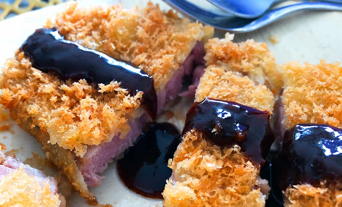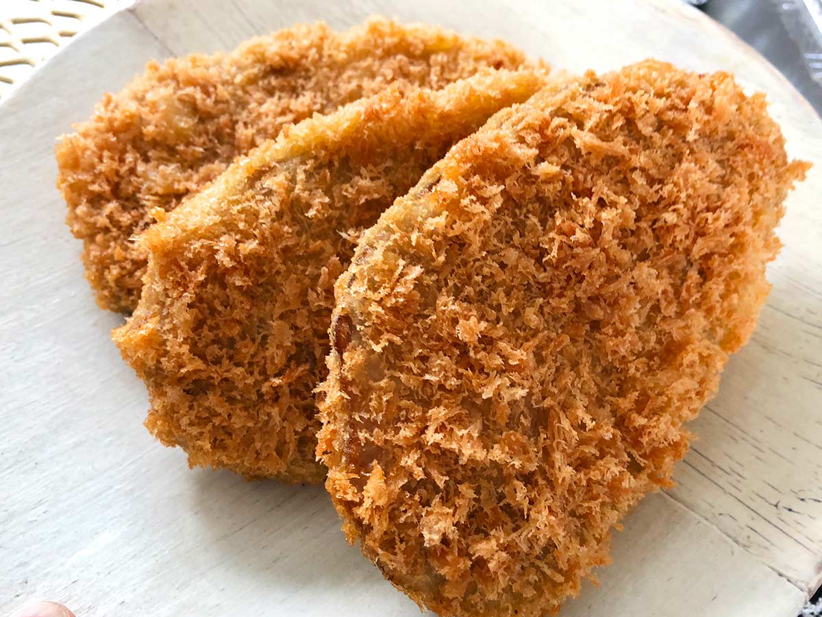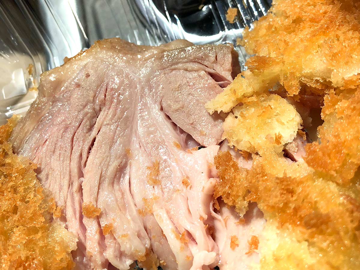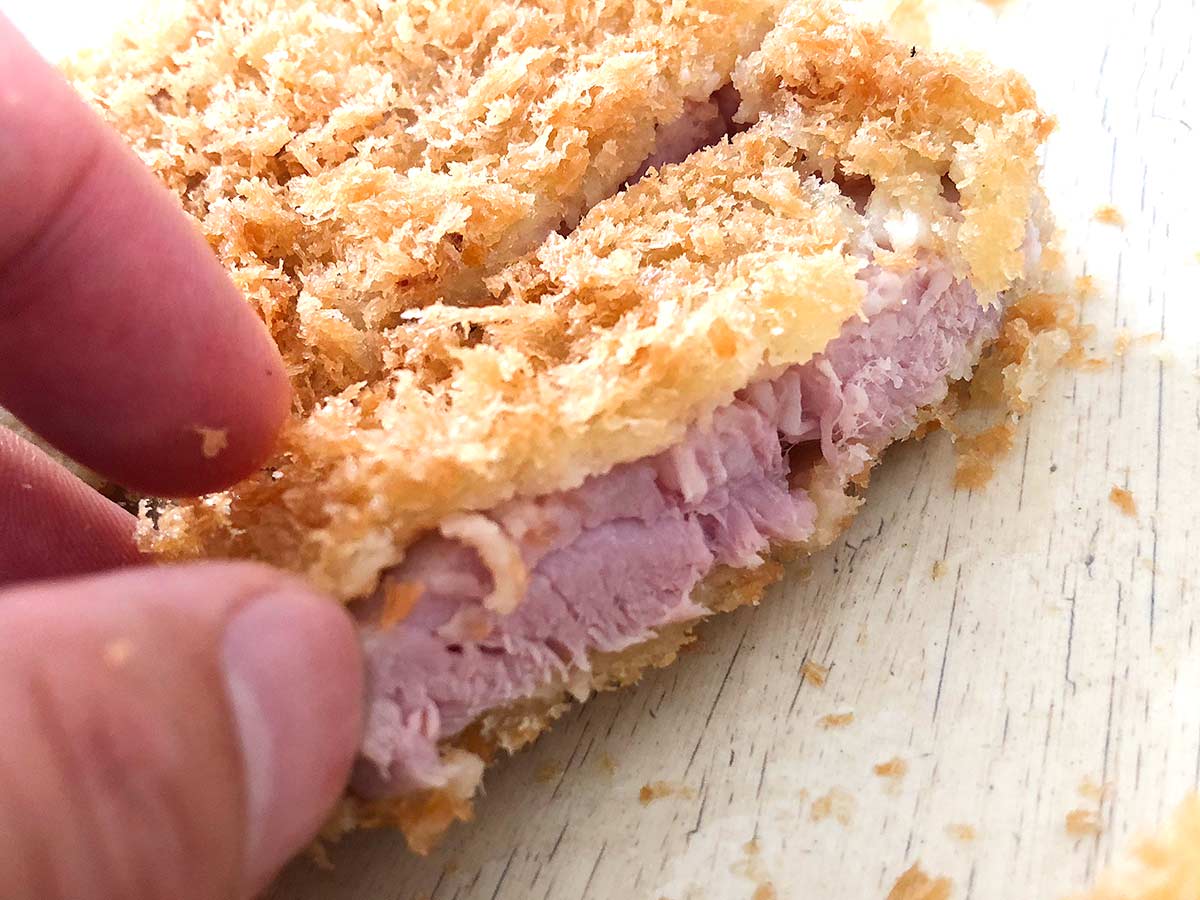 絶妙な揚げ具合のピンク色のキセキカツ。1cm程度の厚さ。食べ方的には塩かけたりとんかつソースをかけたりといろいろ楽しめると思います。
