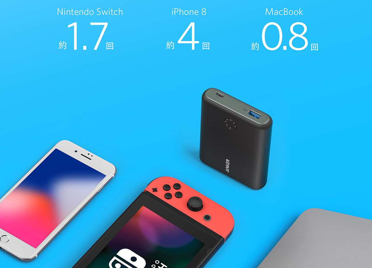 Nintendo Switchを2.5回充電、iPhone8を6回充電、MacBookなら1.3回充電できます。結構すごい、特に今回は、パワーデリバリー対応となっているので用途が広がります。