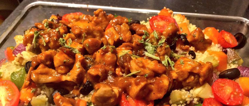 クスクス、好きな野菜、ココナッツオイル(オリーブオイルでも可)、ニンニク、粉末のガラスープ、オリーブ、プチトマト、鶏肉140g、インド系のカレーペースト+ケチャップもしくはケチャップ+A1ソースなければ中濃ソース、カレー粉、ブラックペッパー、パクチー
